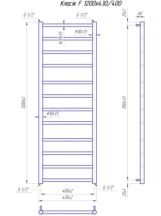Розміри: висота - 1200 мм, ширина - 430 мм, глибина 80 мм, міжцентрова відстань для підключення - 400 мм, діаметр підключення G1/2''.