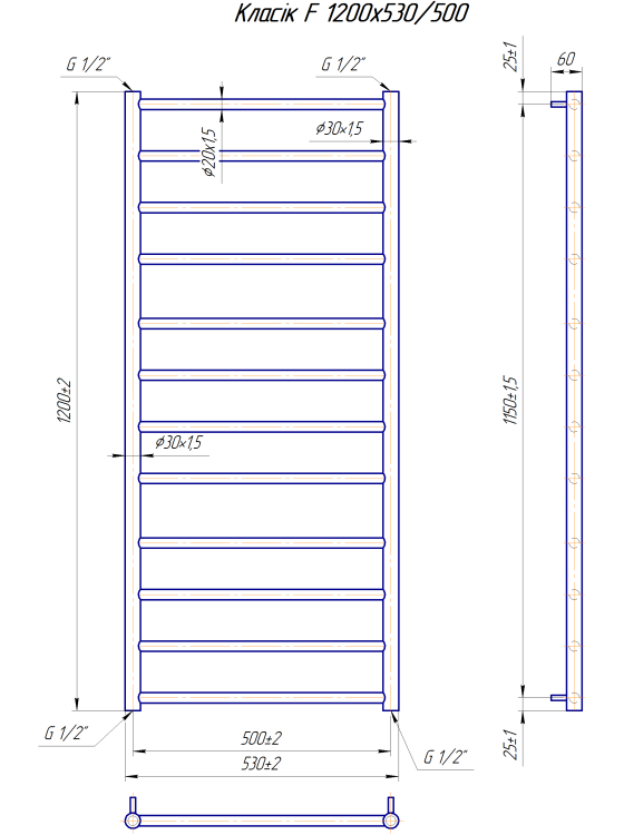 Розміри: висота - 1200 мм, ширина - 530 мм, глибина 80 мм, міжцентрова відстань для підключення - 500 мм, діаметр підключення G1/2''.