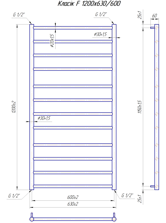 Розміри: висота - 1200 мм, ширина - 630 мм, глибина 80 мм, міжцентрова відстань для підключення - 600 мм, діаметр підключення G1/2''.