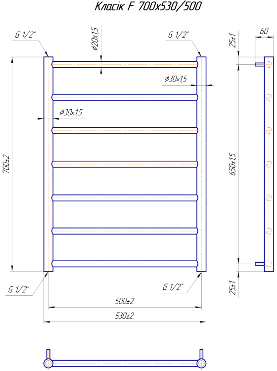 Розміри: висота - 700 мм, ширина - 530 мм, глибина 80 мм, міжцентрова відстань для підключення - 500 мм, діаметр підключення G1/2''.