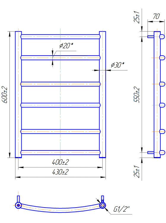Розміри: висота - 600 мм, ширина - 430 мм, глибина 90 мм, міжцентрова відстань для підключення - 400 мм, діаметр підключення G1/2''.