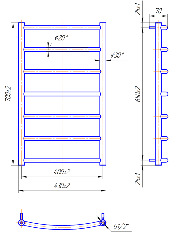 Розміри: висота - 700 мм, ширина - 430 мм, глибина 95 мм, міжцентрова відстань для підключення - 400 мм, діаметр підключення G1/2''.