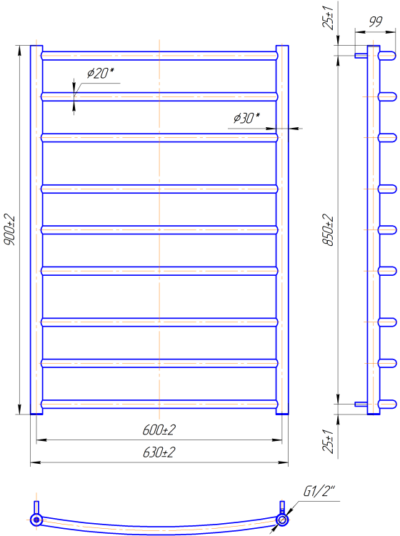 Розміри: висота - 900 мм, ширина - 630 мм, глибина 120 мм, міжцентрова відстань для підключення - 500 мм, діаметр підключення G1/2''.