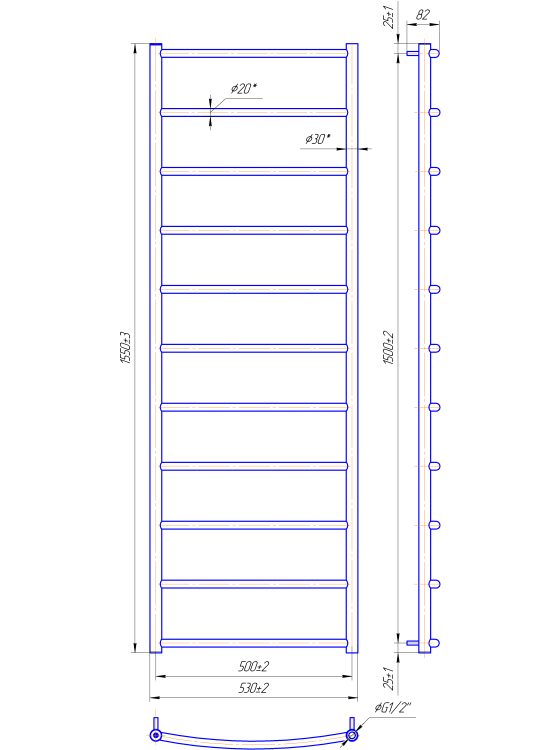 Розміри: висота - 1550 мм, ширина - 530 мм, глибина 105 мм, міжцентрова відстань для підключення - 500 мм, діаметр підключення G1/2''.