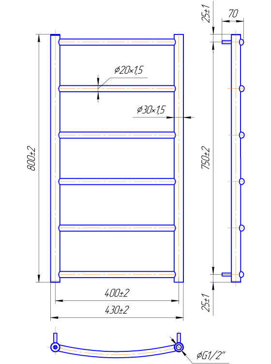 Розміри: висота - 800 мм, ширина - 430 мм, глибина 90 мм, міжцентрова відстань для підключення - 400 мм, діаметр підключення G1/2''.