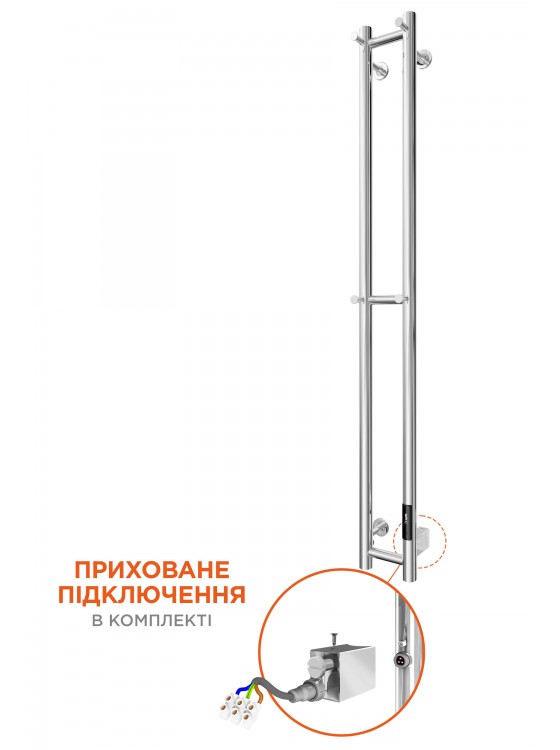 Конектор для підключення в розетку з будь-якого боку. Комплект прихованого підключення. Має 2 перемички та стояки з круглої труби. Виготовлена з полірованої сталі без хромування. Потужність 65 Вт. Додатково для зручності користування можна оснастити гачками. Гарантія – 20 років на корпус / 5 років на електричну частину.