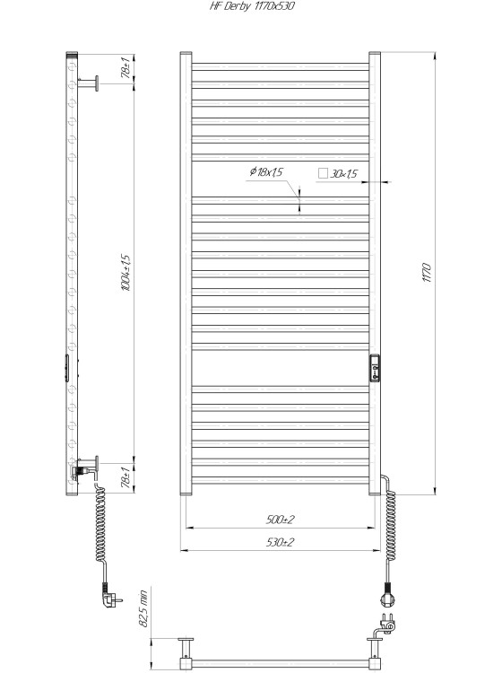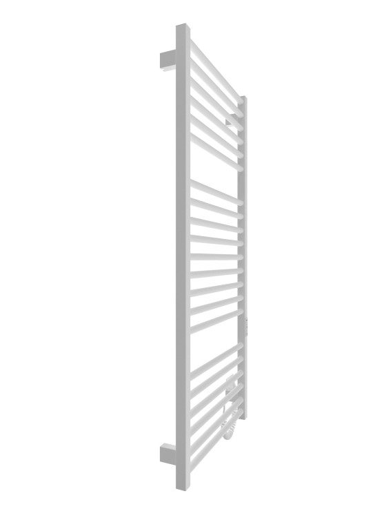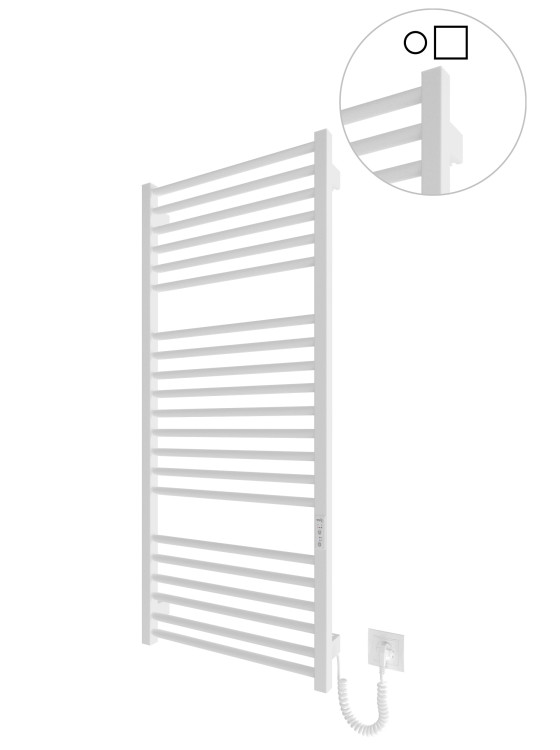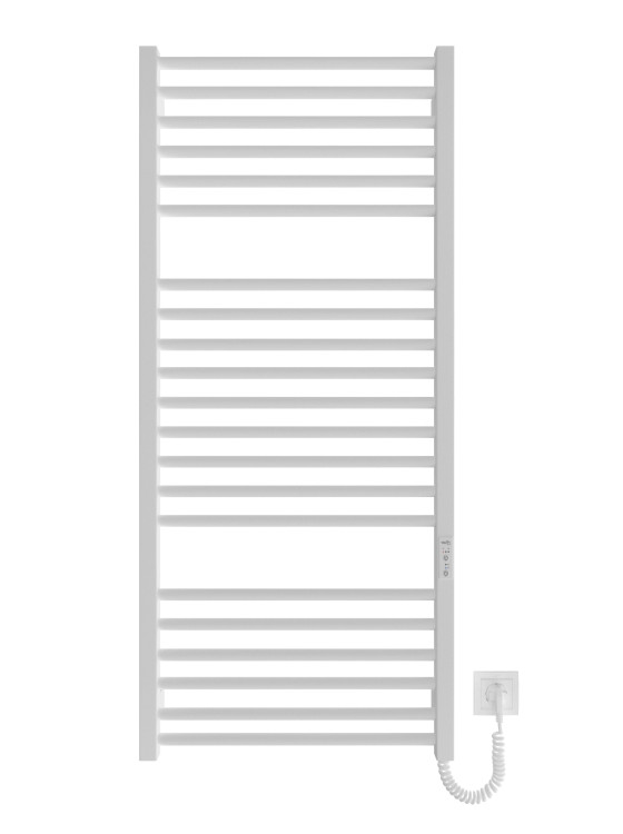 Електрична рушникосушарка HF Derby 1170x530. Працює за технологією сухого ТЕНу. Обладнана вбудованим таймер-регулятором і конектором для підключення до живлення з будь-якого боку. Оснащена комплектом для прихованого підключення. Модель має 21 ребро з круглої труби та стійки з квадратного профілю. Матеріал - чорна сталь з антикорозійною обробкою. Варіанти покриття: чорний мат або білий мат. Температурні режими таймер-регулятора: 40°С, 45°С, 50°С. Час роботи: 3, 6 годин або постійний нагрів. Потужність 240 Вт. Гарантія - 3 роки.