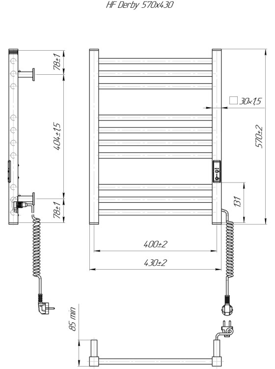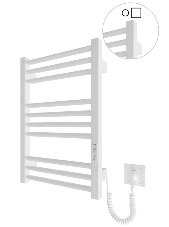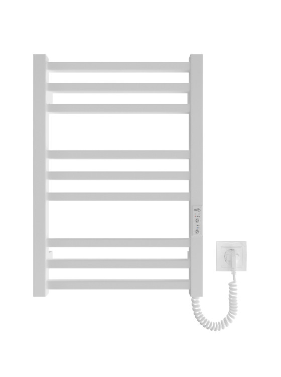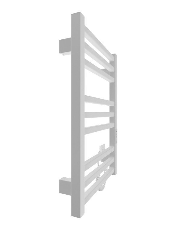 Електрична рушникосушарка HF Derby 570x430. Працює за технологією сухого ТЕНу. Обладнана вбудованим таймер-регулятором і конектором для підключення до живлення з будь-якого боку. Оснащена комплектом для прихованого підключення. Модель має 10 ребер з круглої труби та стійки з квадратного профілю. Матеріал - чорна сталь з антикорозійною обробкою. Варіанти покриття: чорний мат або білий мат. Температурні режими таймер-регулятора: 40°С, 45°С, 50°С. Час роботи: 3, 6 годин або постійний нагрів. Потужність 90 Вт. Гарантія - 3 роки.
