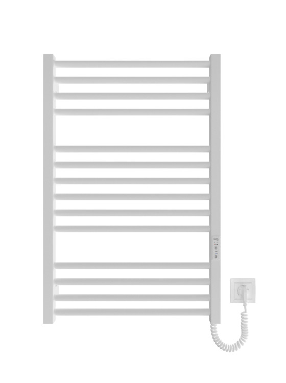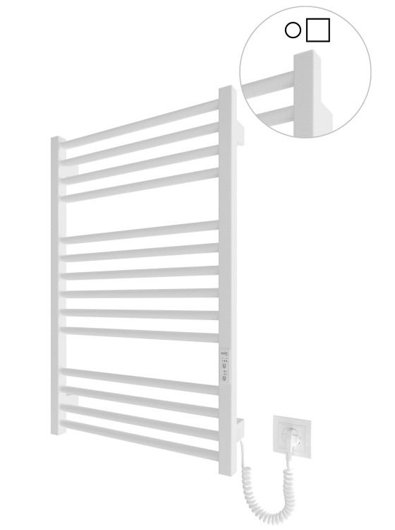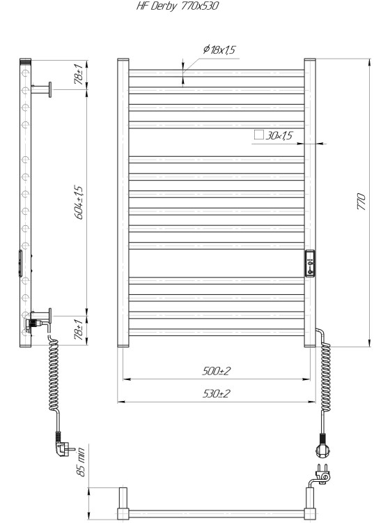Електрична рушникосушарка HF Derby 770x530. Працює за технологією сухого ТЕНу. Обладнана вбудованим таймер-регулятором і конектором для підключення до живлення з будь-якого боку. Оснащена комплектом для прихованого підключення. Модель має 14 ребер з круглої труби та стійки з квадратного профілю. Матеріал - чорна сталь з антикорозійною обробкою. Варіанти покриття: чорний мат або білий мат. Температурні режими таймер-регулятора: 40°С, 45°С, 50°С. Час роботи: 3, 6 годин або постійний нагрів. Потужність 145 Вт. Гарантія - 3 роки