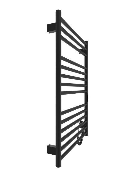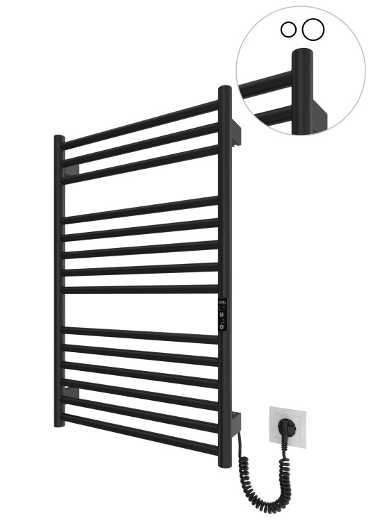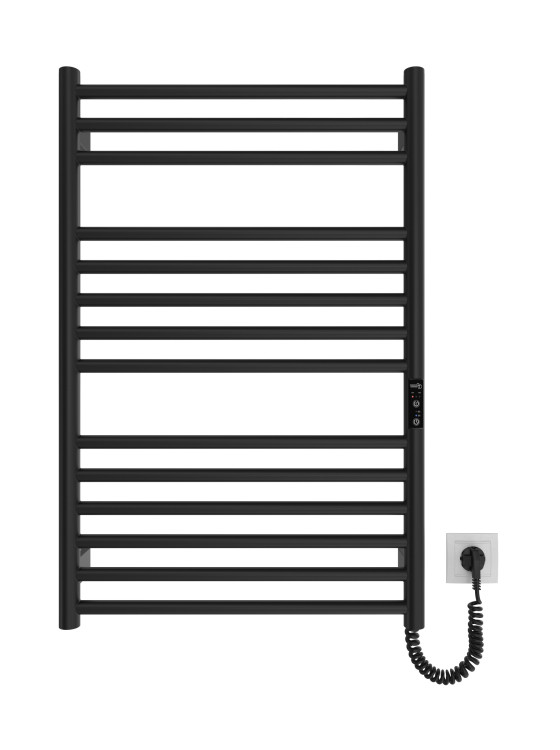 Електрична рушникосушарка HF Greenwich 770х530. Працює за технологією сухого ТЕНу. Обладнана вбудованим таймер-регулятором і конектором для підключення до живлення з будь-якого боку. Оснащена комплектом для прихованого підключення. Модель має 14 ребро з круглої труби та стійки з круглої труби. Матеріал - чорна сталь з антикорозійною обробкою. Варіанти покриття: чорний мат або білий мат. Температурні режими таймер-регулятора: 40°С, 45°С, 50°С. Час роботи: 3, 6 годин або постійний нагрів. Потужність 145 Вт. Гарантія - 3 роки.