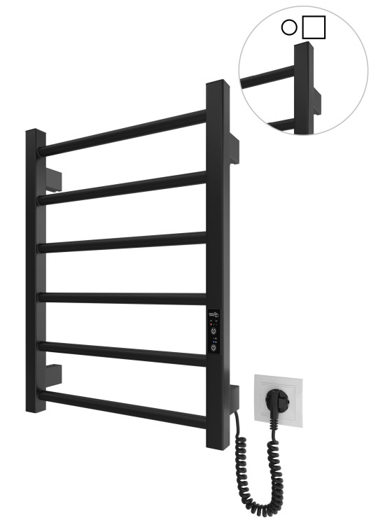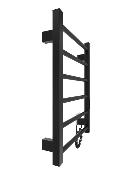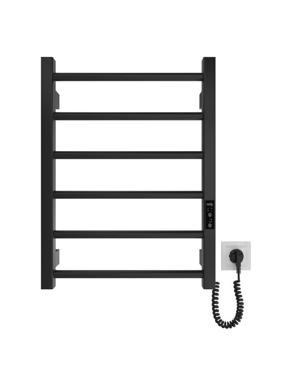 Електрична рушникосушарка HF Leeds 570x430. Працює за технологією сухого ТЕНу. Обладнана вбудованим таймер-регулятором і конектором для підключення до живлення з будь-якого боку. Оснащена комплектом для прихованого підключення. Модель має 6 ребер з круглої труби та стійки з квадратного профілю. Матеріал - чорна сталь з антикорозійною обробкою. Варіанти покриття: чорний мат або білий мат. Температурні режими таймер-регулятора: 40°С, 45°С, 50°С. Час роботи: 3, 6 годин або постійний нагрів. Потужність 60 Вт. Гарантія - 3 роки