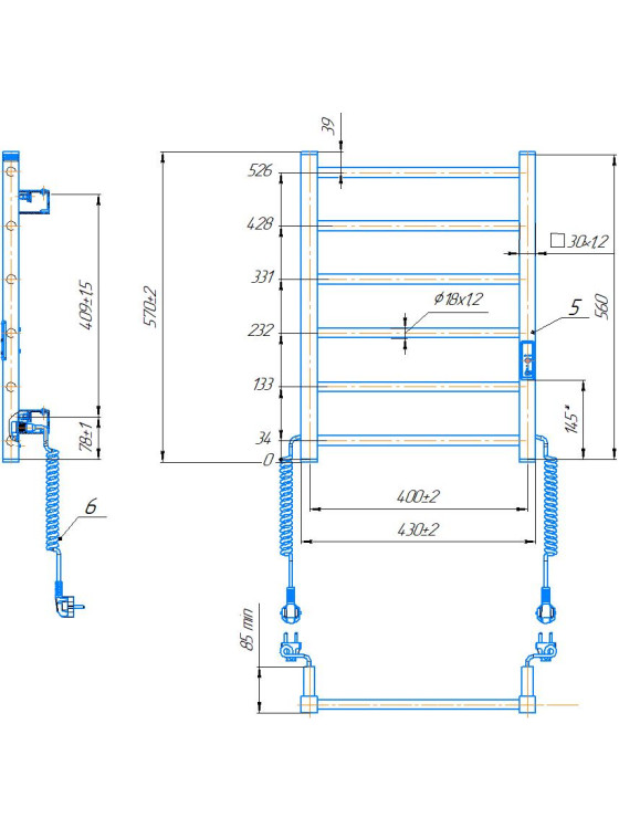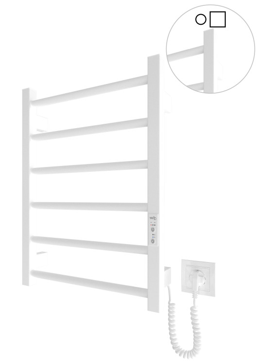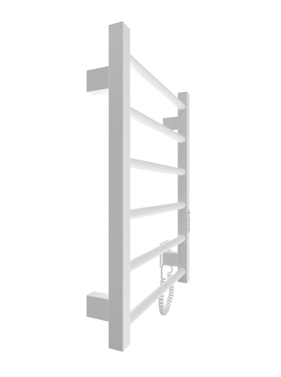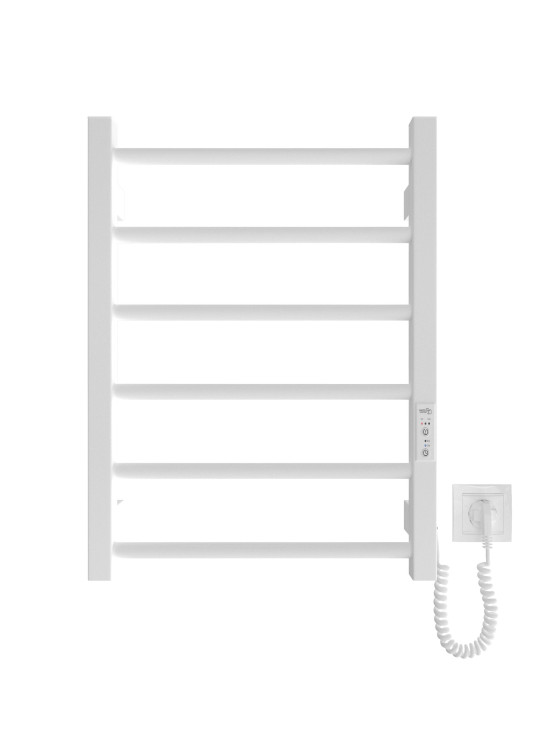 Електрична рушникосушарка HF Leeds 570x430. Працює за технологією сухого ТЕНу. Обладнана вбудованим таймер-регулятором і конектором для підключення до живлення з будь-якого боку. Оснащена комплектом для прихованого підключення. Модель має 6 ребер з круглої труби та стійки з квадратного профілю. Матеріал - чорна сталь з антикорозійною обробкою. Варіанти покриття: чорний мат або білий мат. Температурні режими таймер-регулятора: 40°С, 45°С, 50°С. Час роботи: 3, 6 годин або постійний нагрів. Потужність 60 Вт. Гарантія - 3 роки