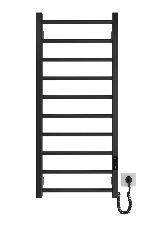 Електрична рушникосушарка HF Leeds 970x430. Працює за технологією сухого ТЕНу. Обладнана вбудованим таймер-регулятором і конектором для підключення до живлення з будь-якого боку. Оснащена комплектом для прихованого підключення. Модель має 10 ребер з круглої труби та стійки з квадратного профілю. Матеріал - чорна сталь з антикорозійною обробкою. Варіанти покриття: чорний мат або білий мат. Температурні режими таймер-регулятора: 40°С, 45°С, 50°С. Час роботи: 3, 6 годин або постійний нагрів. Потужність 120 Вт. Гарантія - 3 роки