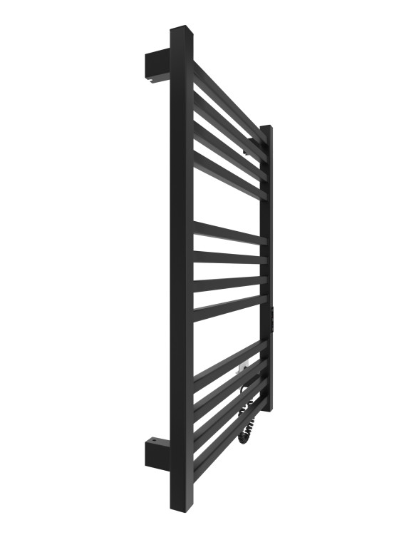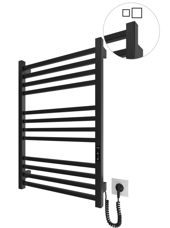 Електрична рушникосушарка HF London 770х530. Працює за технологією сухого ТЕНу. Обладнана вбудованим таймер-регулятором і конектором для підключення до живлення з будь-якого боку. Оснащена комплектом для прихованого підключення. Модель має 12 ребр з квадратної труби та стійки з квадратної труби. Матеріал - чорна сталь з антикорозійною обробкою(фосфотація). Варіанти покриття: чорний мат або білий мат. Температурні режими таймер-регулятора: 40°С, 45°С, 50°С. Час роботи: 3, 6 годин або постійний нагрів. Потужність 130 Вт. Гарантія - 3 роки.