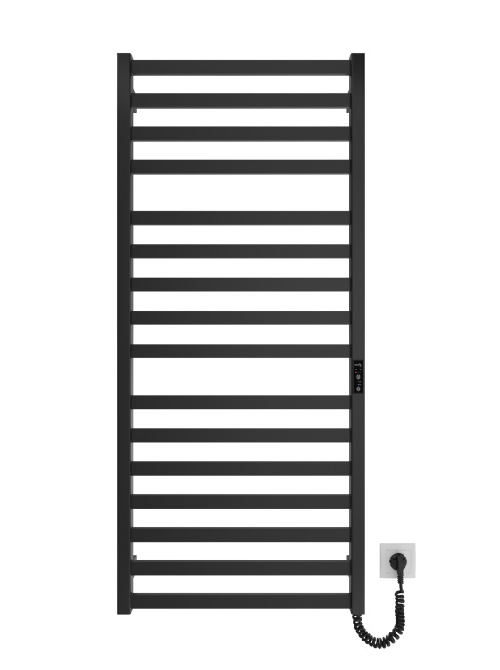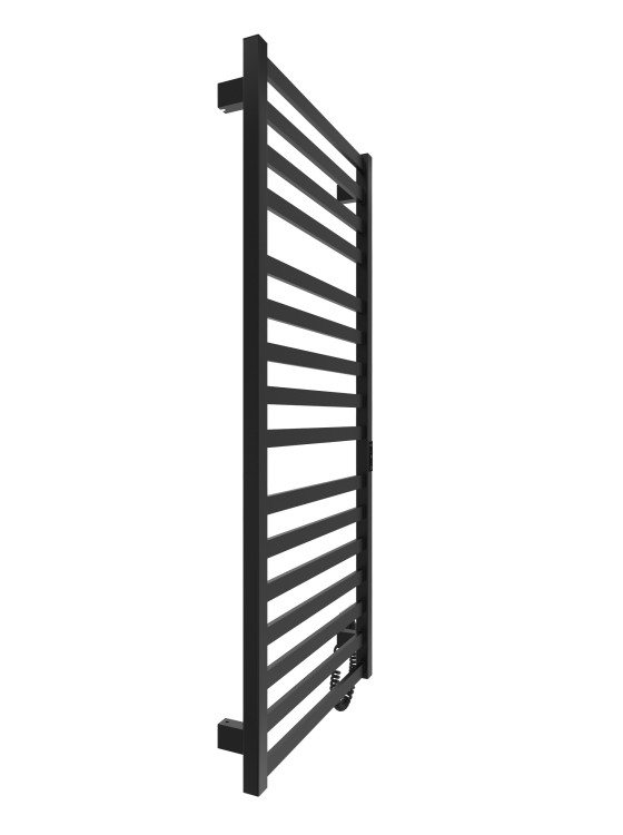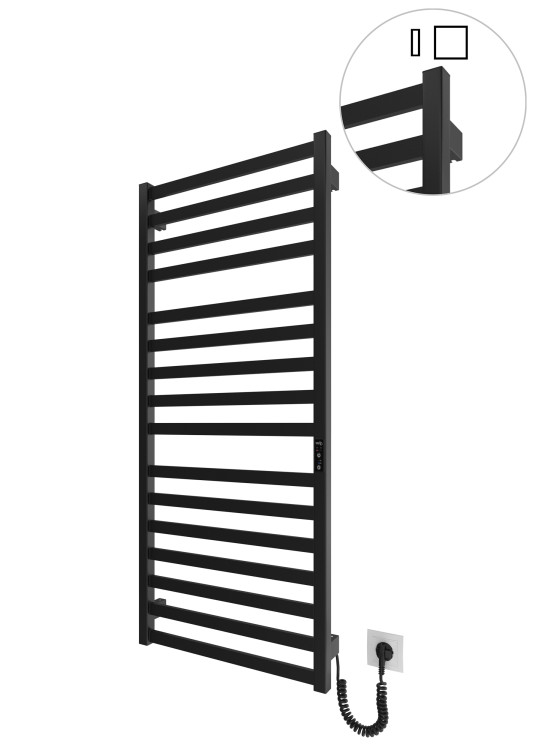 Електрична рушникосушарка HF Oxford 1170х530. Працює за технологією сухого ТЕНу. Обладнана вбудованим таймер-регулятором і конектором для підключення до живлення з будь-якого боку. Оснащена комплектом для прихованого підключення. Модель має 16 ребр з прямокутногої труби та стійки з квадратної труби. Матеріал - чорна сталь з антикорозійною обробкою(фосфотація). Варіанти покриття: чорний мат або білий мат. Температурні режими таймер-регулятора: 40°С, 45°С, 50°С. Час роботи: 3, 6 годин або постійний нагрів. Потужність 195 Вт. Гарантія - 3 роки.