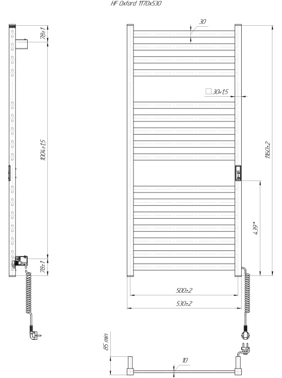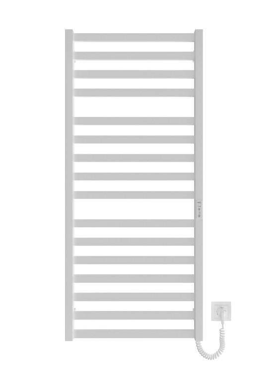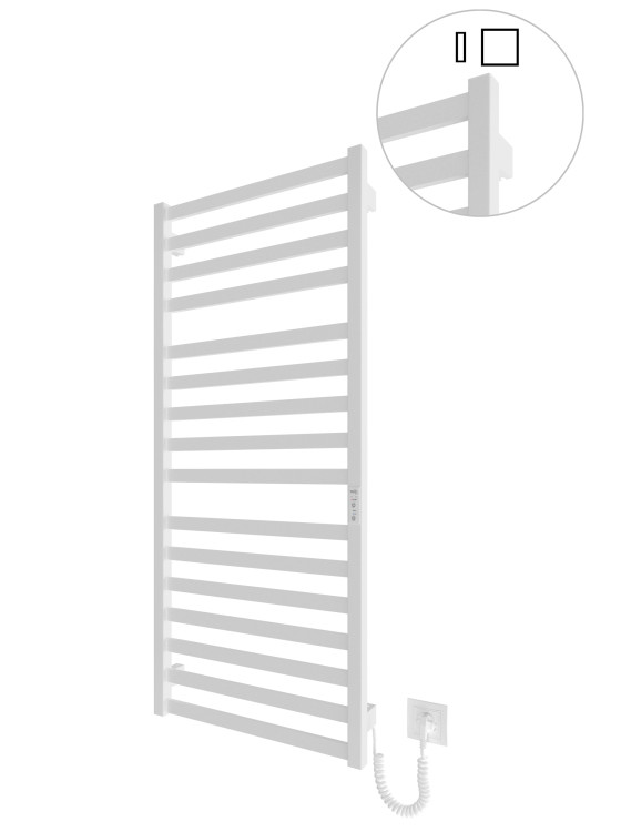 Електрична рушникосушарка HF Oxford 1170х530. Працює за технологією сухого ТЕНу. Обладнана вбудованим таймер-регулятором і конектором для підключення до живлення з будь-якого боку. Оснащена комплектом для прихованого підключення. Модель має 16 ребр з прямокутногої труби та стійки з квадратної труби. Матеріал - чорна сталь з антикорозійною обробкою(фосфотація). Варіанти покриття: чорний мат або білий мат. Температурні режими таймер-регулятора: 40°С, 45°С, 50°С. Час роботи: 3, 6 годин або постійний нагрів. Потужність 195 Вт. Гарантія - 3 роки.