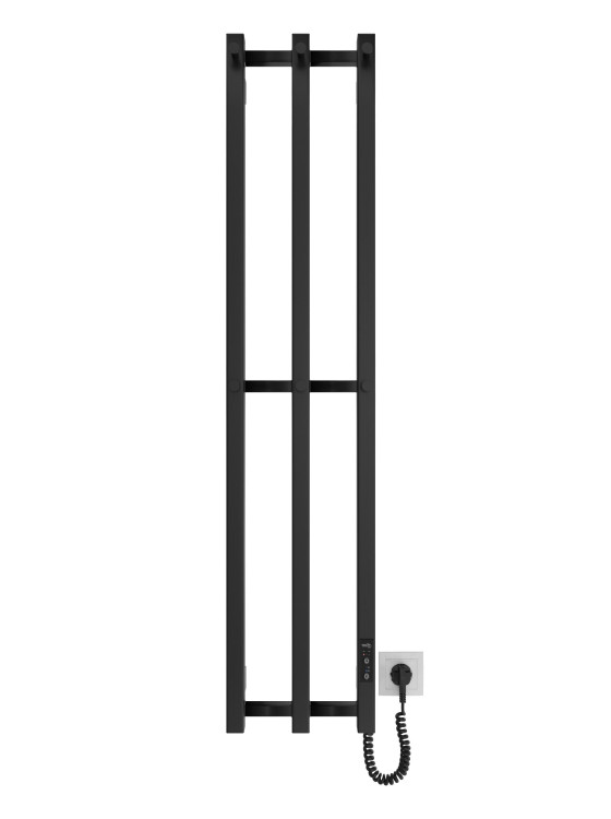 Електрична рушникосушарка HF Slim 1170х250. Працює за технологією сухого ТЕНу. Обладнана вбудованим таймер-регулятором і конектором для підключення до живлення з будь-якого боку. Оснащена комплектом для прихованого підключення. Модель має32 ребера з круглої труби та стійки з квадратного профілю. Матеріал - чорна сталь з антикорозійною обробкою. Варіанти покриття: чорний мат або білий мат. Температурні режими таймер-регулятора: 40°С, 45°С, 50°С. Час роботи: 3, 6 годин або постійний нагрів. Потужність 110 Вт. Гарантія - 3 роки.