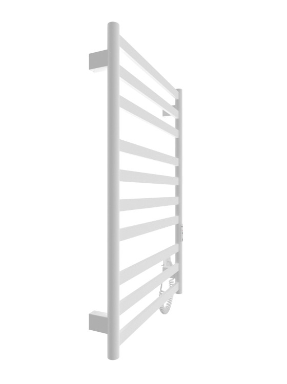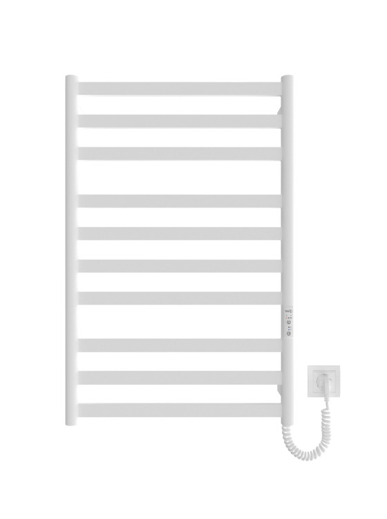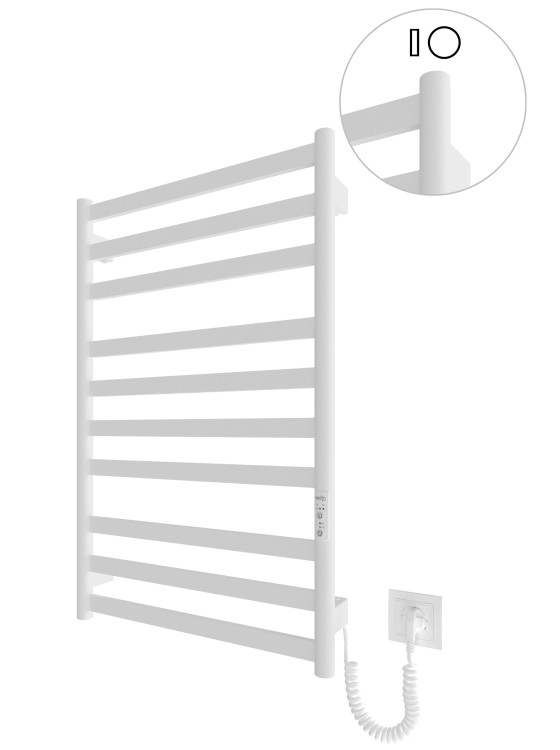 Електрична рушникосушарка HF York 770х530. Працює за технологією сухого ТЕНу. Обладнана вбудованим таймер-регулятором і конектором для підключення до живлення з будь-якого боку. Оснащена комплектом для прихованого підключення. Модель має 10 ребр з прямокутногої труби та стійки з круглої труби. Матеріал - чорна сталь з антикорозійною обробкою. Варіанти покриття: чорний мат або білий мат. Температурні режими таймер-регулятора: 40°С, 45°С, 50°С. Час роботи: 3, 6 годин або постійний нагрів. Потужність 130 Вт. Гарантія - 3 роки.