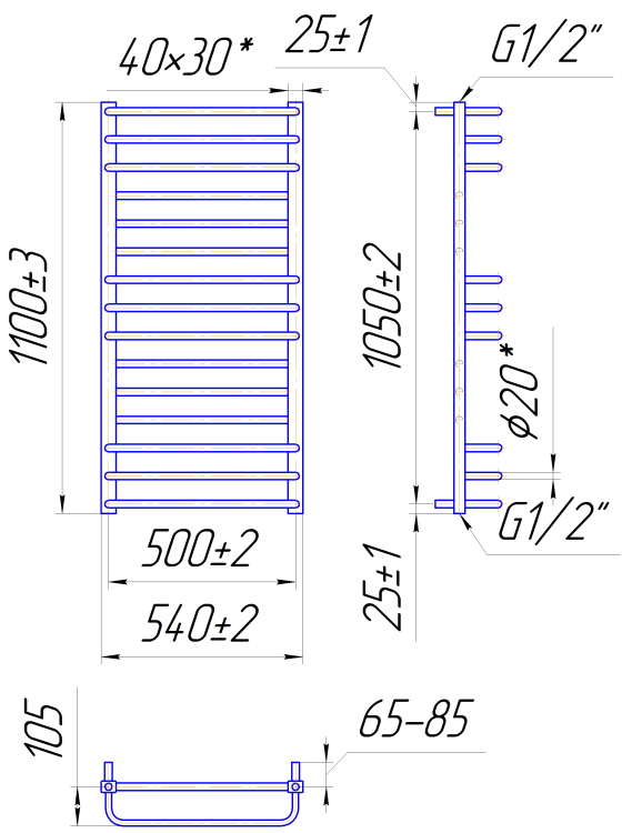 Розміри: висота - 1100 мм, ширина - 540 мм, глибина 170 мм, міжцентрова відстань для підключення - 500 мм, діаметр підключення G1/2''.