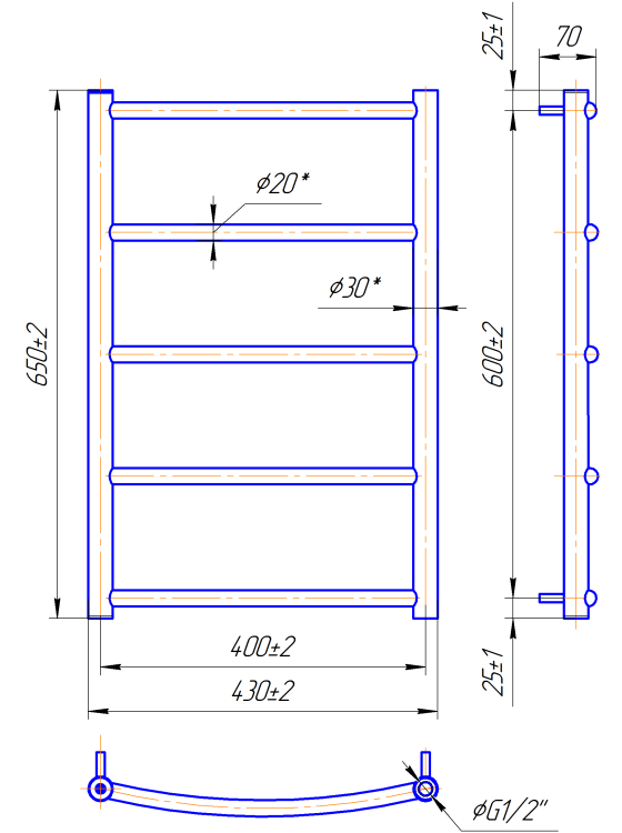 Водяной полотенцесушитель "Марио" Класік НР 650х430/400 . Размеры: высота – 650 мм, ширина – 430 мм, глубина – 90 мм, межосевое расстояние для подключения – 400 мм, диаметр подключения G1/2'. Количество перекладин – 5, вертикальные стойки изготовлены из круглой трубы. Изготовлен из полированной нержавеющей стали без хромирования. Для круглогодичной работы водяную модель можно переоборудовать в комбинированную, установив ТЭН. Рекомендуемая мощность — 120 Вт. Совместимые аксессуары: поворотные полки и навесные крючки для расширения функциональности. Рекомендуется подключать полотенцесушитель с использованием кранов Mario. Гарантия — 50 лет в закрытой системе отопления, 5 лет — в централизованной.