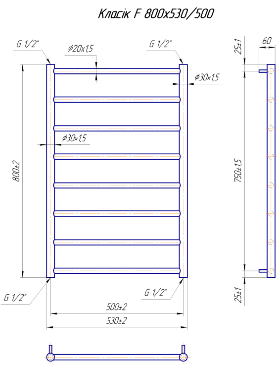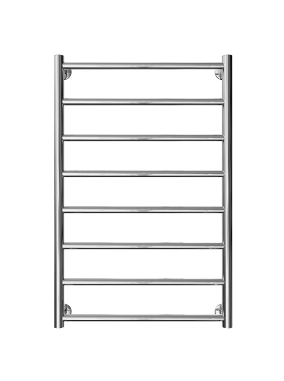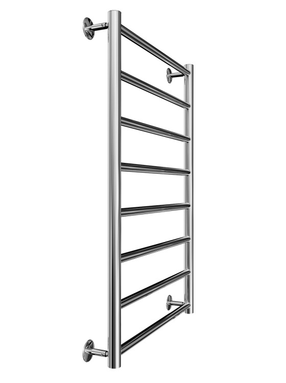 Водяной полотенцесушитель "Марио" Класік F 800х530/500. Размеры: высота – 800 мм, ширина – 530 мм, глубина – 80 мм, межосевое расстояние для подключения – 500 мм, диаметр подключения G1/2'. Количество перекладин – 8, вертикальные стойки изготовлены из круглой трубы. Изготовлен из полированной нержавеющей стали без хромирования. Для круглогодичной работы водяную модель можно переоборудовать в комбинированную, установив ТЭН. Рекомендуемая мощность — 200 Вт. Совместимые аксессуары: поворотные полки и навесные крючки для расширения функциональности. Рекомендуется подключать полотенцесушитель с использованием кранов Mario. Гарантия — 50 лет в закрытой системе отопления, 5 лет — в централизованной.