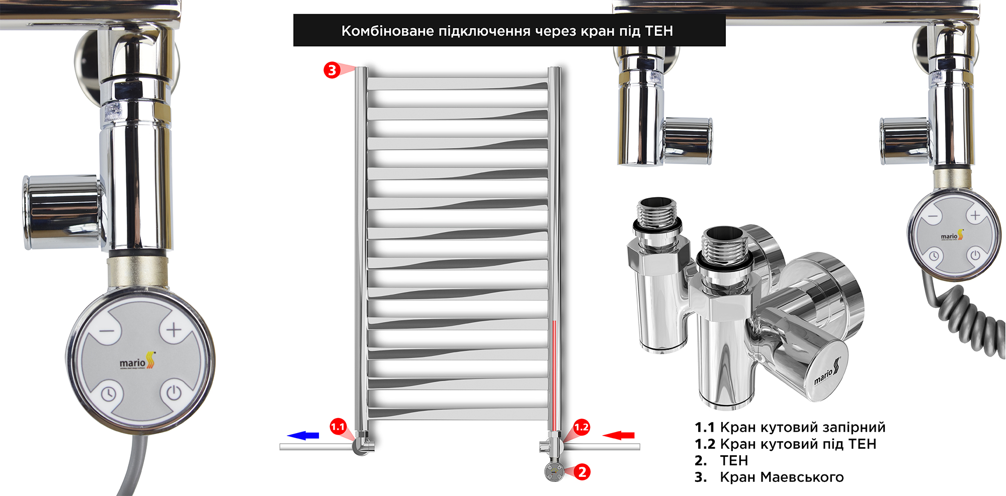 Комбинированный полотенцесушитель - это водяной полотенцесушитель Марио, который подключается к системе централизованного отопления, при этом в конструкцию сушки вносится дополнительный элемент - электрический ТЭН, который устанавливается в кран под ТЭН, или монтируется с помощью дополнительных фитингов, тем самым объединяя в себе лучшие качества водяного и электрического полотенцесушителя.
