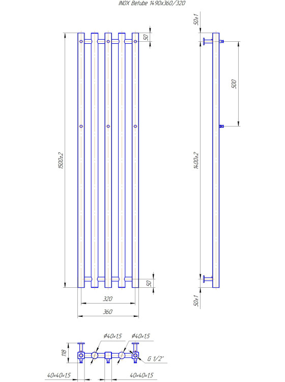 Водяной полотенцесушитель INOX Бітуб 1490х360/320. Размеры: высота – 1 490 мм, ширина – 360 мм, глубина – 107 мм, межосевое расстояние для подключения – 320 мм, диаметр подключения G1/2'. Количество перекладин – 5, вертикальные стойки изготовлены из круглой трубы. Изготовлен из полированной нержавеющей стали без хромирования. Для круглогодичной работы водяную модель можно переоборудовать в комбинированную, установив ТЭН. Рекомендуемая мощность — 600 Вт. Совместимые аксессуары: поворотные полки и навесные крючки для расширения функциональности. Рекомендуется подключать полотенцесушитель с использованием кранов Mario. Гарантия — 50 лет в закрытой системе отопления, 5 лет — в централизованной.