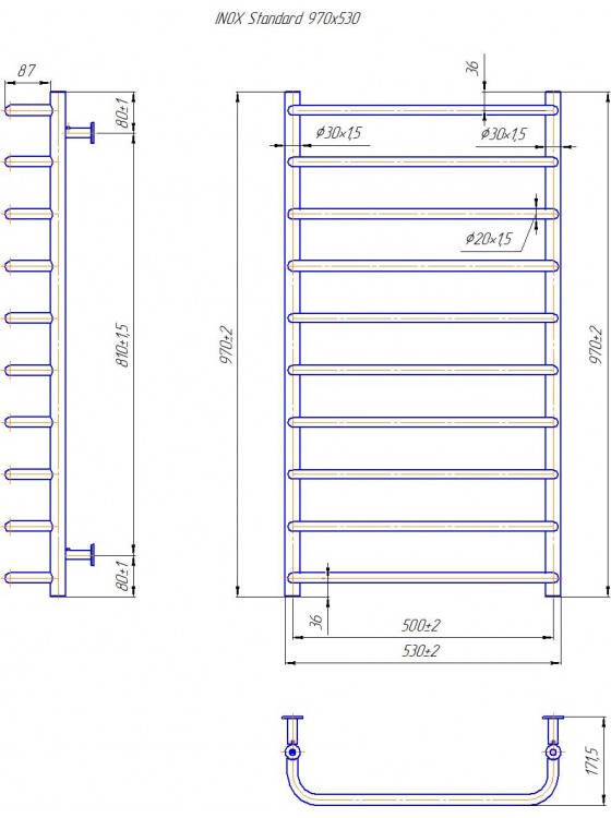 Полотенцесушитель INOX Стандарт 970х530/500. Розміри: висота - 970 мм, ширина - 530 мм, глибина 170 мм, міжцентрова відстань для підключення - 500 мм, діаметр підключення G1/2''. Варіанти підключення: нижнє, діагональне та бічне. Количество ребер - 10. Виготовлена з полірованої нержавіючої сталі без хромування. Для всесезонної роботи водяну модель можна переобладнати на комбіновану, встановивши ТЕН, рекомендована потужність 600 Вт. Сумісні аксесуари: поворотні полиці та навісні гачки для збільшення функціональності. Рекомендовано підключати рушникосушарку за допомогою кранів Маріо. Гарантия - 50 років в закрытой системе отопления, 5 років у централізованій.