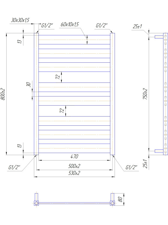Водяной полотенцесушитель "Марио" Санті 800х530/500. Размеры: высота – 800 мм, ширина – 530 мм, глубина – 80 мм, межосевое расстояние для подключения – 500 мм, диаметр подключения G1/2'. Количество перекладин – 8, вертикальные стойки изготовлены из круглой трубы. Изготовлен из полированной нержавеющей стали без хромирования. Для круглогодичной работы водяную модель можно переоборудовать в комбинированную, установив ТЭН. Рекомендуемая мощность — 300 Вт. Совместимые аксессуары: поворотные полки и навесные крючки для расширения функциональности. Рекомендуется подключать полотенцесушитель с использованием кранов Mario. Гарантия — 50 лет в закрытой системе отопления, 5 лет — в централизованной.