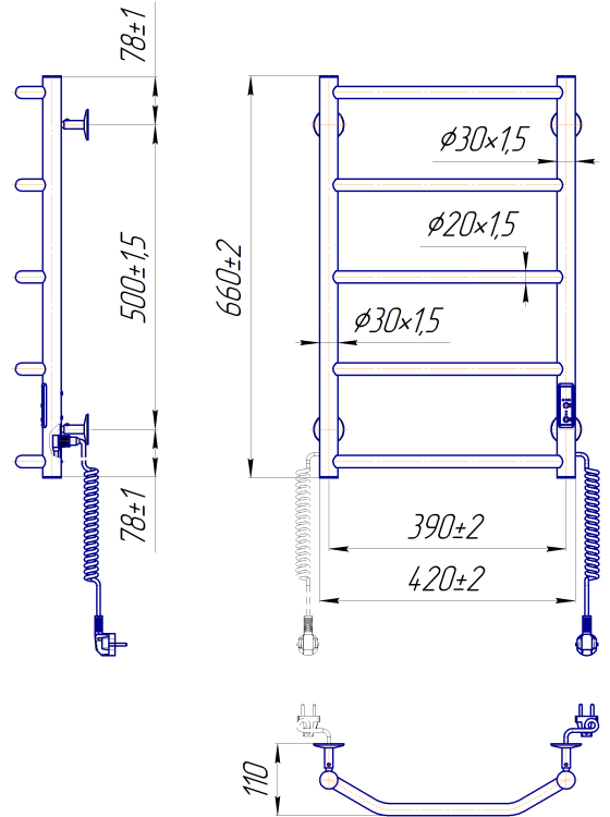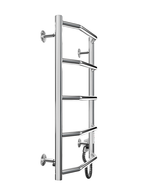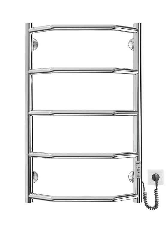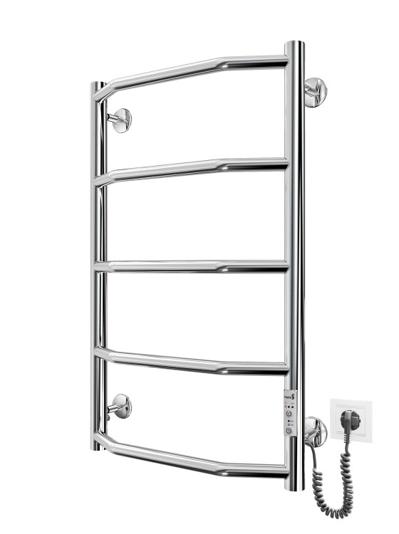 Бытовая электрическая полотенцесушилка Рушникосушка Трапеція НР-І 650х430/110 електр. TR К. Оснащена таймер-регулятором и коннектором для подключения к розетке с любой стороны. Совместима с комплектом скрытого подключения. Имеет 5 перекладин и стойки. Изготовлена из полированной нержавеющей стали без хромирования. Температурные режимы таймер-регулятора: 40°С, 45°С, 50°С. Варианты времени работы: 3, 6 часов и постоянный нагрев. Мощность [3 Вт]. Для удобства использования можно дополнительно оснастить навесными крючками. Гарантия — 60 месяцев.