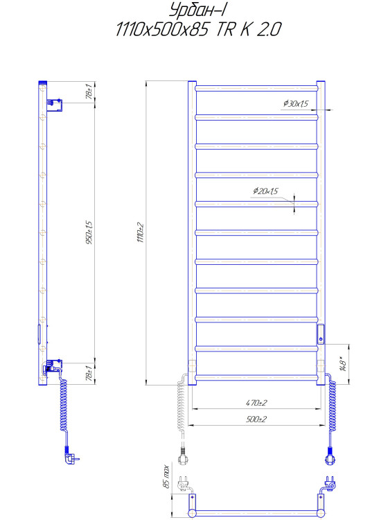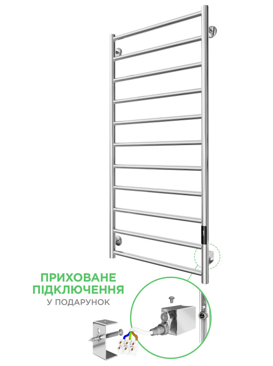 Бытовая электрическая полотенцесушилка Рушникосушка Урбан-I 1110x500/85 TR K 2.0. Оснащена таймер-регулятором и коннектором для подключения к розетке с любой стороны. Совместима с комплектом скрытого подключения. Имеет 11 перекладин и стойки. Изготовлена из полированной нержавеющей стали без хромирования. Температурные режимы таймер-регулятора: 40°С, 45°С, 50°С. Варианты времени работы: 3, 6 часов и постоянный нагрев. Мощность [3 Вт]. Для удобства использования можно дополнительно оснастить навесными крючками. Гарантия — 60 месяцев.