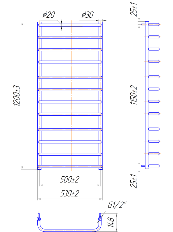 Розміри: висота - 1200 мм, ширина - 530 мм, глибина 170 мм, міжцентрова відстань для підключення - 500 мм, діаметр підключення G1/2''.