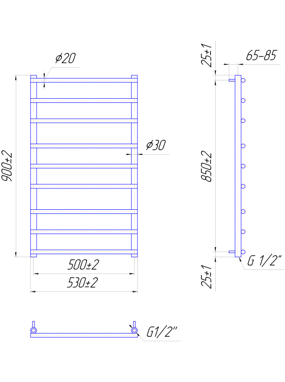 Розміри: висота - 900 мм, ширина - 530 мм, глибина 100 мм, міжцентрова відстань для підключення - 500 мм, діаметр підключення G1/2''.